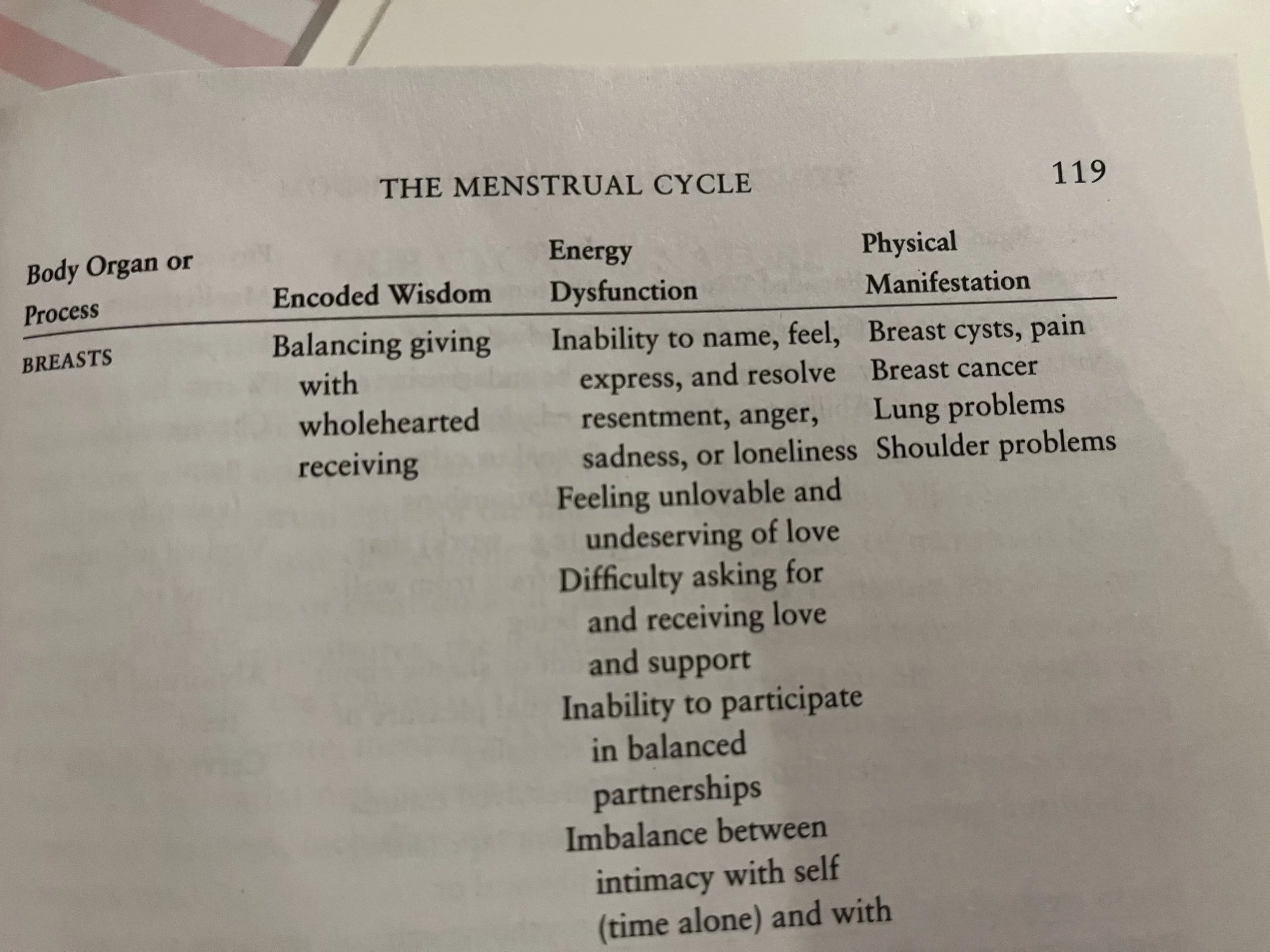 Anyways. I looked up in a book I adore, recalling I had come across this subject before and there it was. Breast pain associating with exactly what I going through. Having difficulty with putting names to my emotions, not letting myself actually feel them, feeling unsupported, also having a hard time receiving. etc. etc. (you should check that book out, it’s called Women’s Bodies, Women’s Wisdom by Christiane Northrup M.D.)